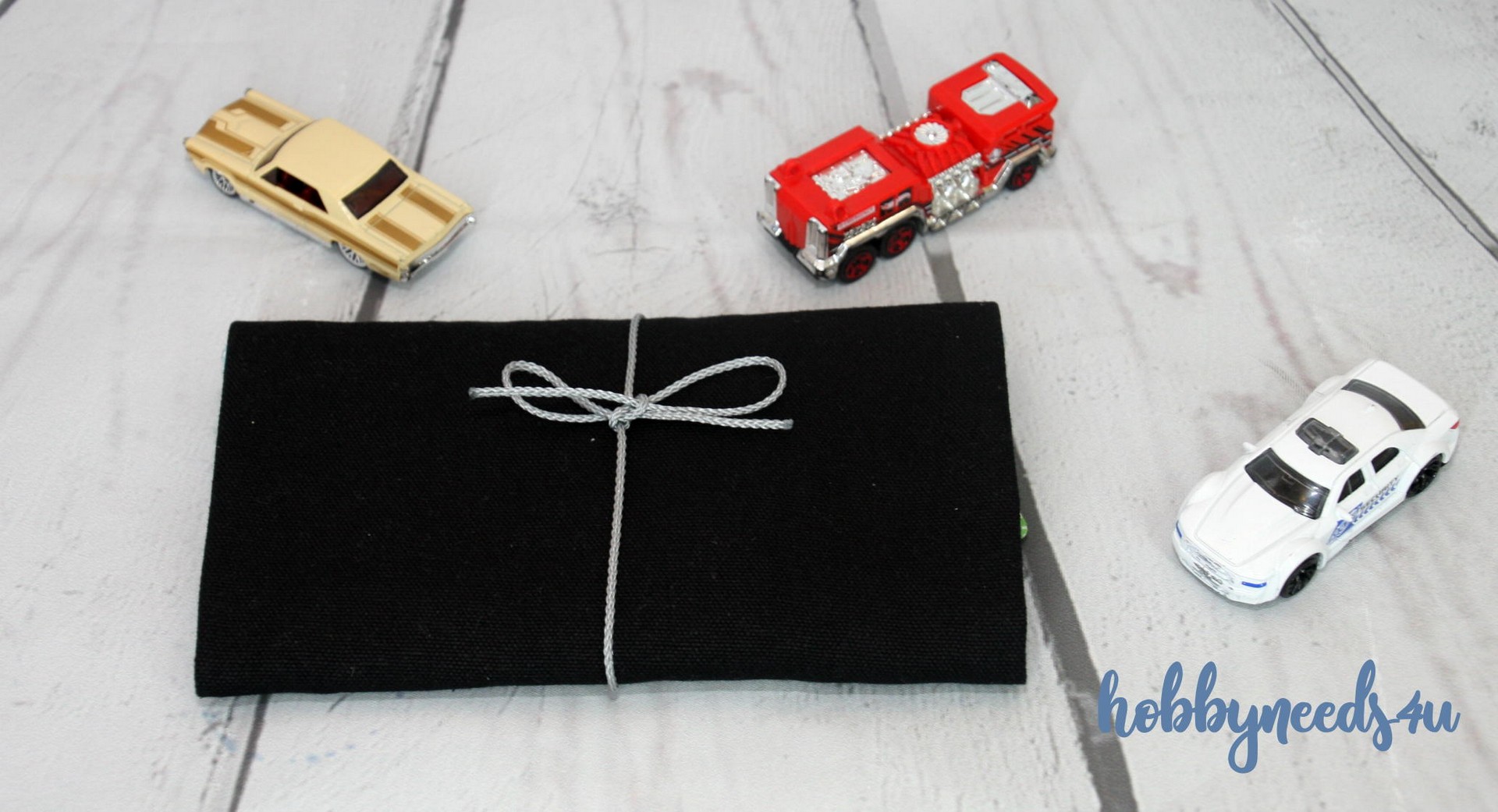 In dieser Tasche finden bis zu 4 Spielzeugautos Platz und sie haben gleich eine Straße mit dabei.