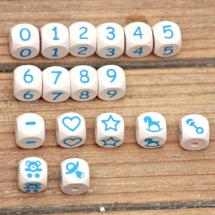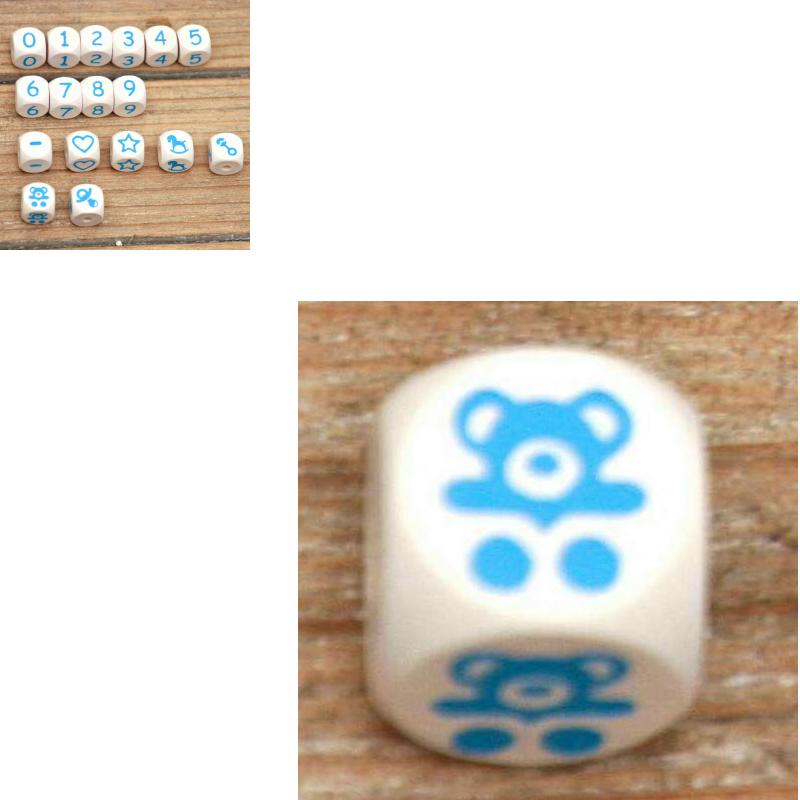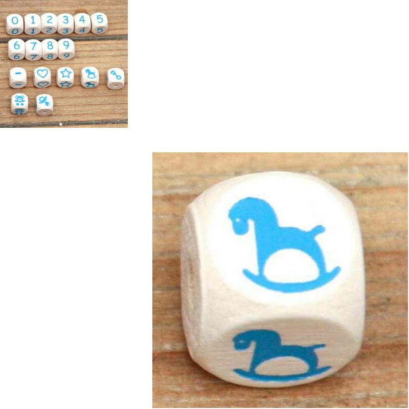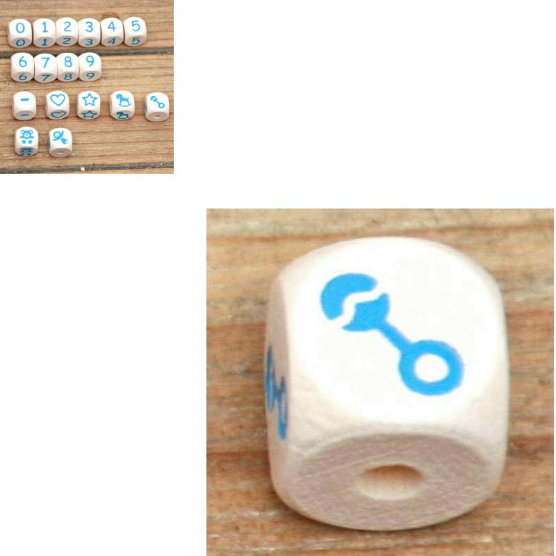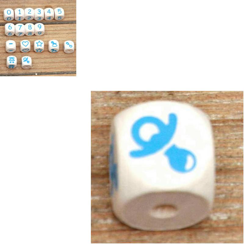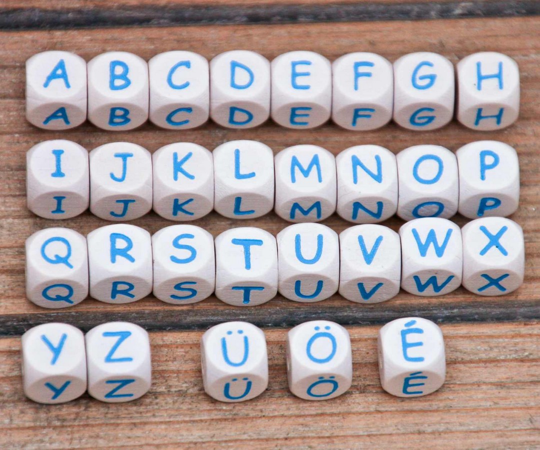 Sie erhalten geprägte Buchstabenwürfel in hell lackiert mit hellblauer Schriftfarbe (geprägt).
