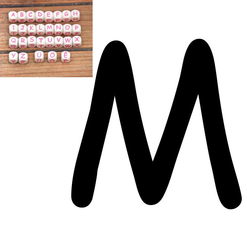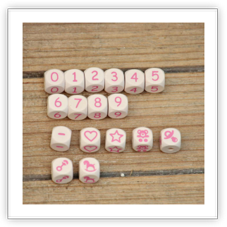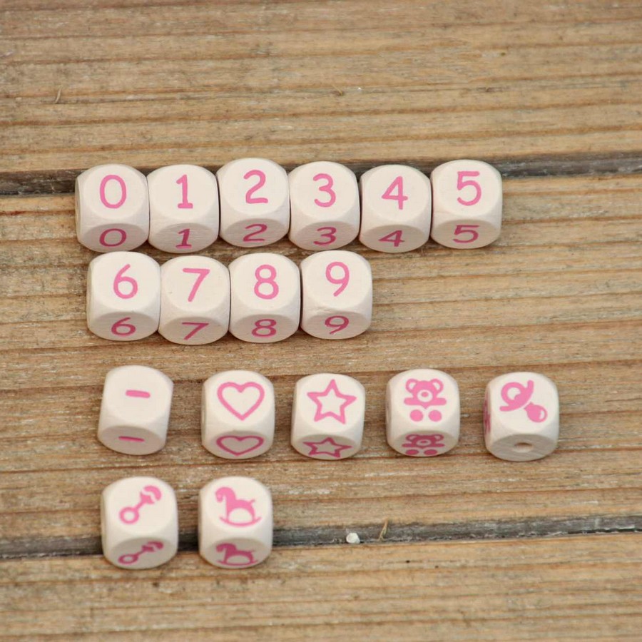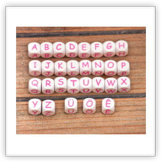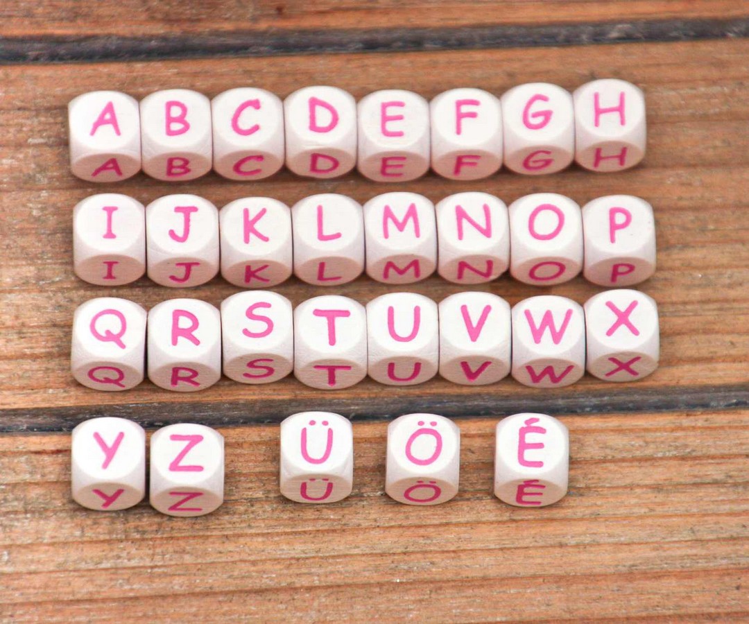 Sie erhalten geprägte Buchstabenwürfel in hell lackiert mit pinker Schriftfarbe.