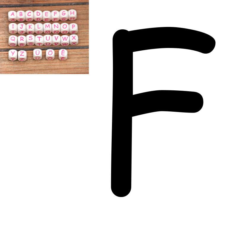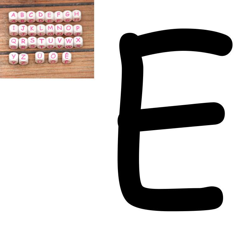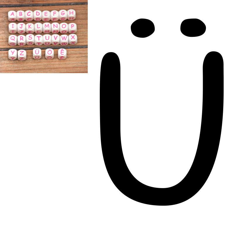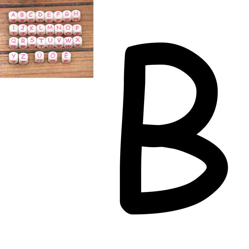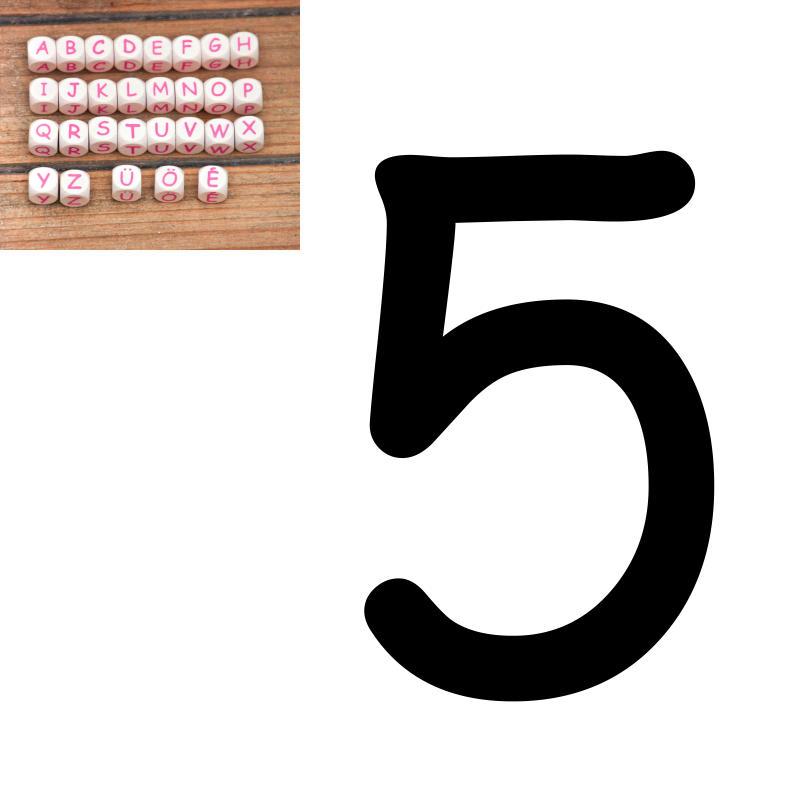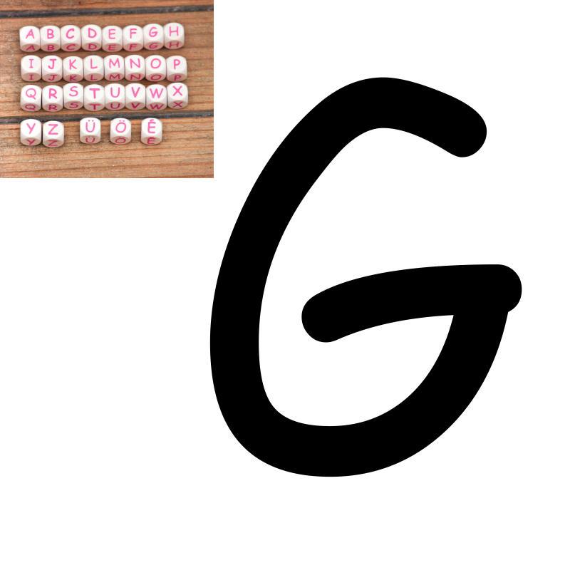 Die Ecken der geprägten Buchstabenwürfel sind abgerundet und haben eine Kantenlänge von 10mm. Die Buchstaben sind geprägt.