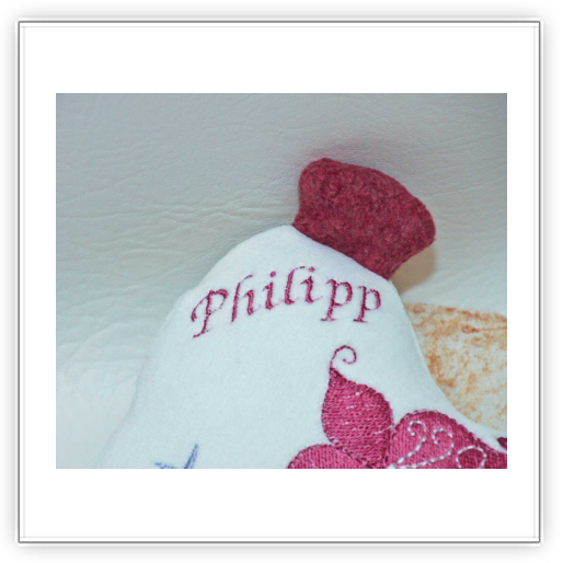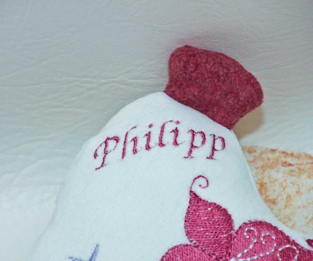 Der Name wird in rosa aufgestickt