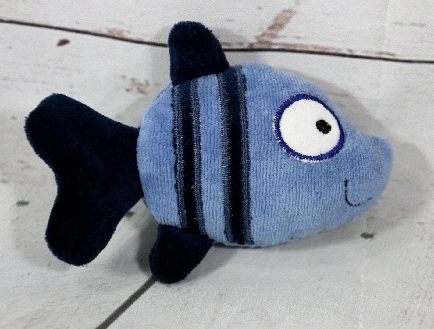Der Körper ist aus 100% Baumwolle gefertigt (Nicki und Frottee). Gefüllt ist der kleine Fisch mit allergikerfreundlicher PE Faser.