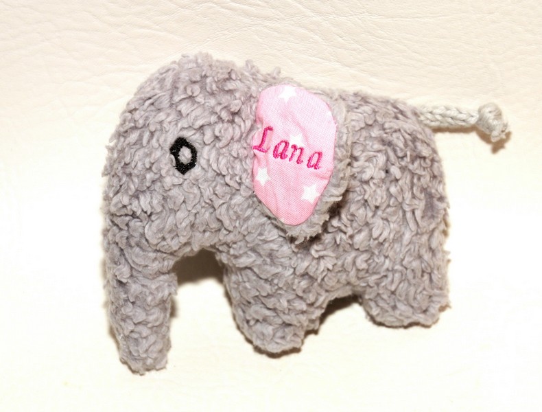 Dieser süße Kuschelelefant ist ca. 14 cm lang, 12 cm hoch und 4 cm breit (ohne Ohren gemessen). Der Körper ist aus 100% Bio Baumwoll Plüsch gefertigt, die Vorderseite der Ohren aus 100% Baumwolle. Gefüllt ist der kleine Elefant mit allergikerfreundlicher PE Faser. Das linke Ohr kann gegen Aufpreis (+3€) mit einem Namen bestickt werden. Bitte beachten Sie, das Ohr ist nur 4 cm breit, ein langer Name wird daher sehr klein von der Schriftgröße. Außerdem kann der Körper des kleinen Elefanten rasseln (Aufpreis 1,5€). Waschbar bei 30 Grad. Stickdatei: Cornelia König