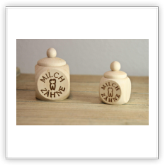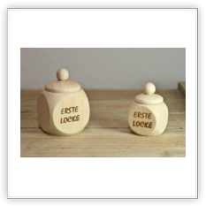 Die Dosen sind sowohl "pur" als auch mit fertiger Prägung ("erste Locke", "Milchzähne") vorrätig.
