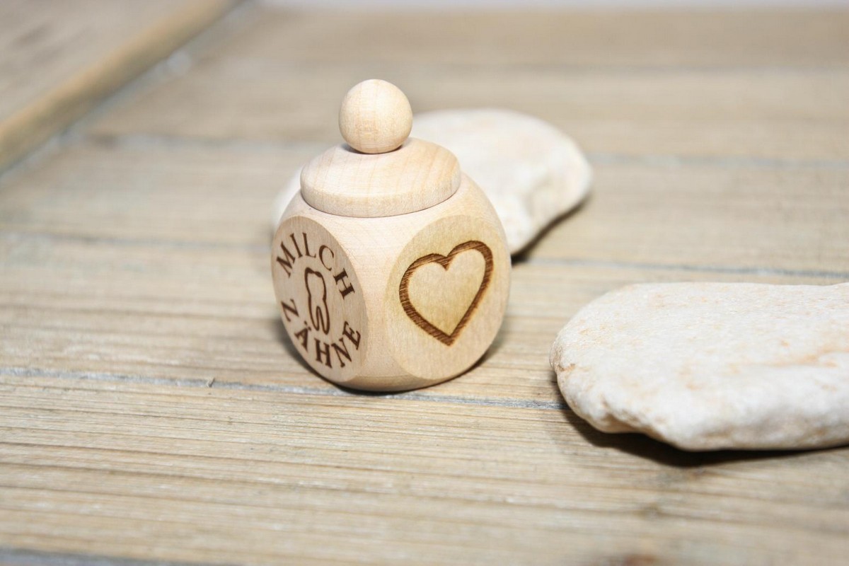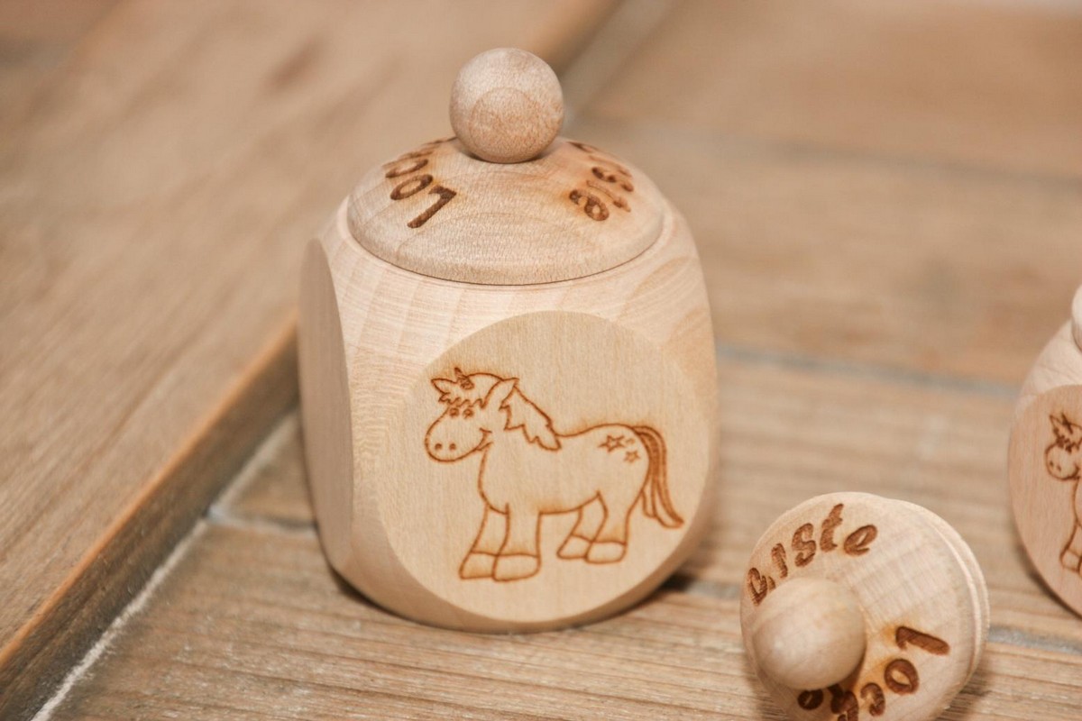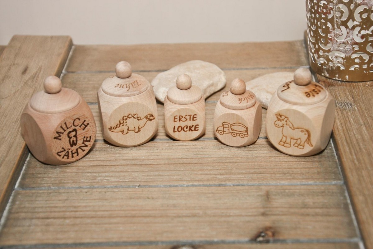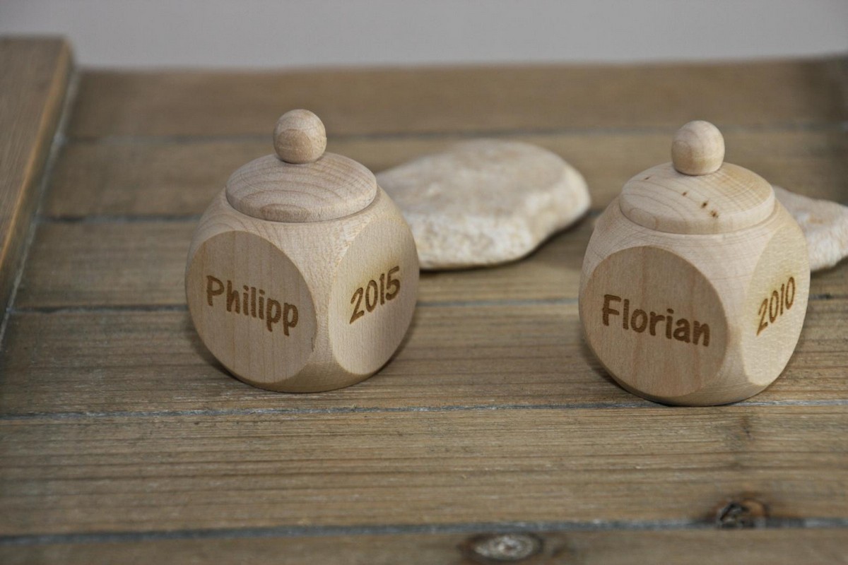 Diese Dose aus unbehandeltem einheimischen Ahornholz eignet sich durch den festen Schraubverschluß gut als sichere Aufbewahrung für Milchzähne, die erste Locke, kleine Schätze, u.v.m!