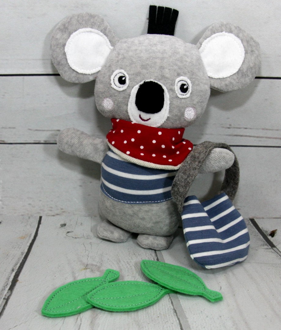 Die Koalas sind los - ob mit Sommerfrisur in Nicki oder wuschelig in Plüsch - immer aus 100% Baumwolle (Bio) als Obermaterial und gefüllt mit allergikerfreundlicher PE Faser (100% Polyester). Shirt und TAsche bestehen aus Bio Jersey (95% Baumwolle, 5% Elasthan) und die kleinen Elemente aus 100% Wolle (Filz).