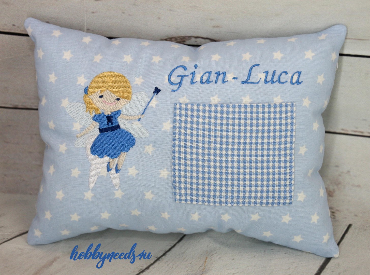 Dieses Zahnfeekissen ist die ideale 'Verpackung' für ein Geldstück der Zahnfee. Das Kissen ist ca. 16 cm x 11 cm x 4 cm groß, der Bezug besteht aus 100% Baumwolle und die Füllung aus allergikerfreundlichem 100% Polyester. Das Kissen kann mit dem Namen (in dunkelblau) bestickt werden (Aufpreis 3€). Diesen geben Sie bitte bei der Bestellung als Hinweis an oder schreiben eine email an: