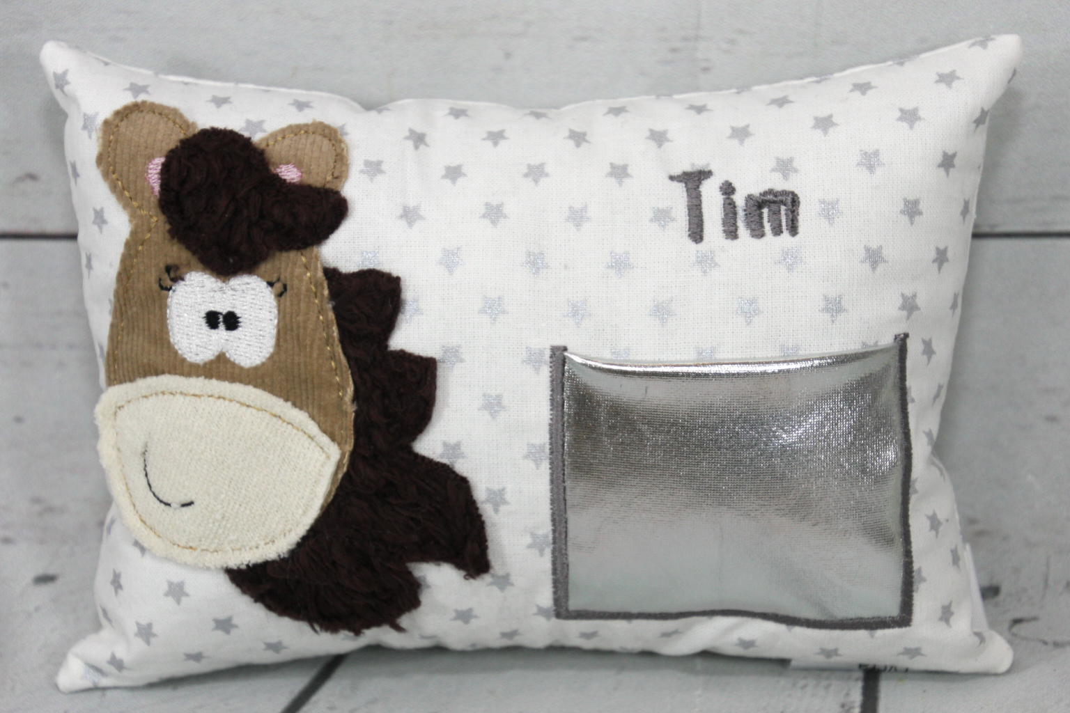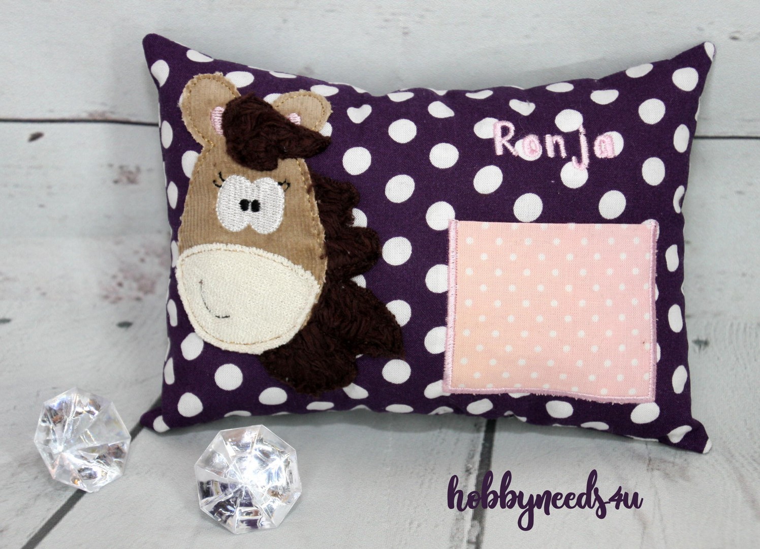 Das Kissen ist ca. 18 cm x 14 cm x 5 cm groß, der Bezug besteht aus 100% Baumwolle und die Füllung aus allergikerfreundlicher PE Faser. Das Kissen kann mit dem Namen bestickt werden (Aufpreis 3€). Diesen geben Sie bitte bei der Bestellung als Hinweis an oder schreiben eine email an: